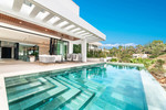 Deze hedendaagse villa in Madroñal, Benahavís, biedt adembenemend panoramisch zeezicht binnen een exclusieve afgesloten gemeenschap met 24-uursbeveiliging.
