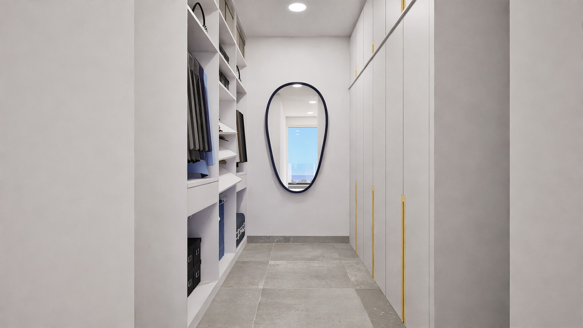 Eerste verdieping: 3 slaapkamers. De master is een volledige suite met inloopkast. Een tweede slaapkamer heeft ook een eigen inloopkast.