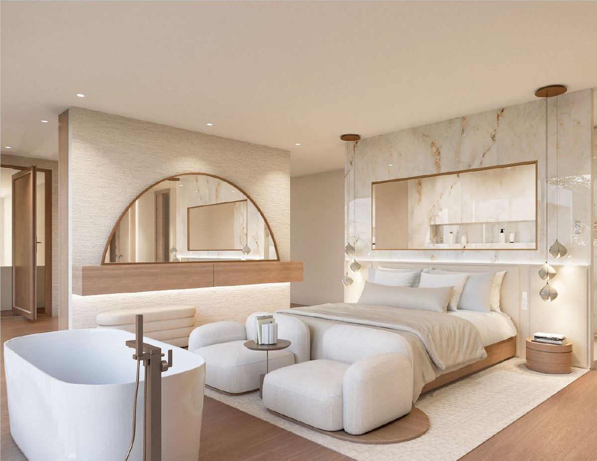 De master suite voelt als een vijfsterrenverblijf, met een vrijstaand bad bij het raam, privéspa, designkleedkamer en terras met uitzicht op de bergen.