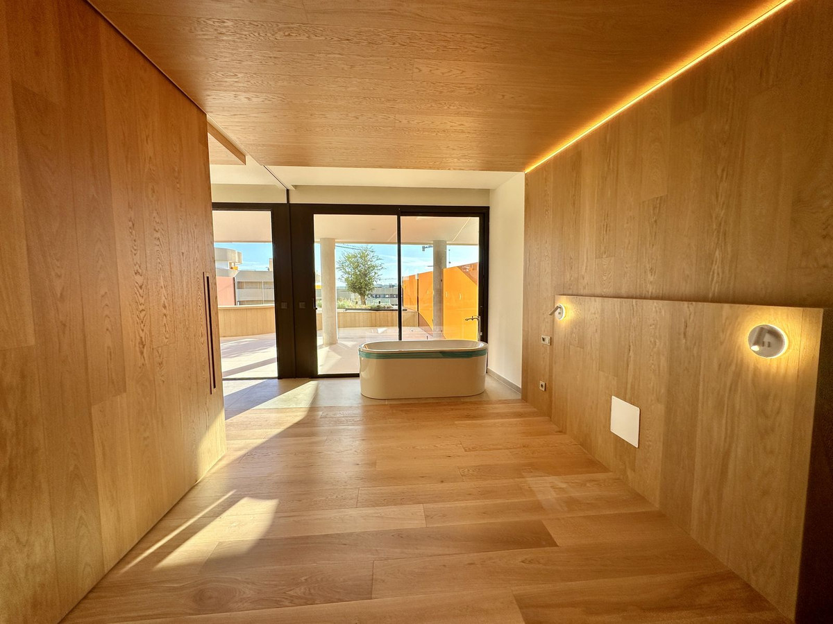 Rich wooden floors combined with natural wood detailing on walls and ceilings add warmth, texture, and a refined architectural character throughout the home.