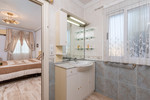 De eerste verdieping verwelkomt u met een gastentoilet, gevolgd door een ruime en lichte woon-eetkamer, speciaal ontworpen en verbonden met een open keuken met directe toegang tot de buitenruimte. De woonkamer is omgeven door grote ramen die de hele dag door zorgen voor veel natuurlijk licht. Op deze verdieping bevinden zich ook twee slaapkamers en een complete badkamer. Vanuit de woonkamer is er directe toegang tot de buitenruimte, waar het zwembad en de buitenkeuken zich bevinden.
