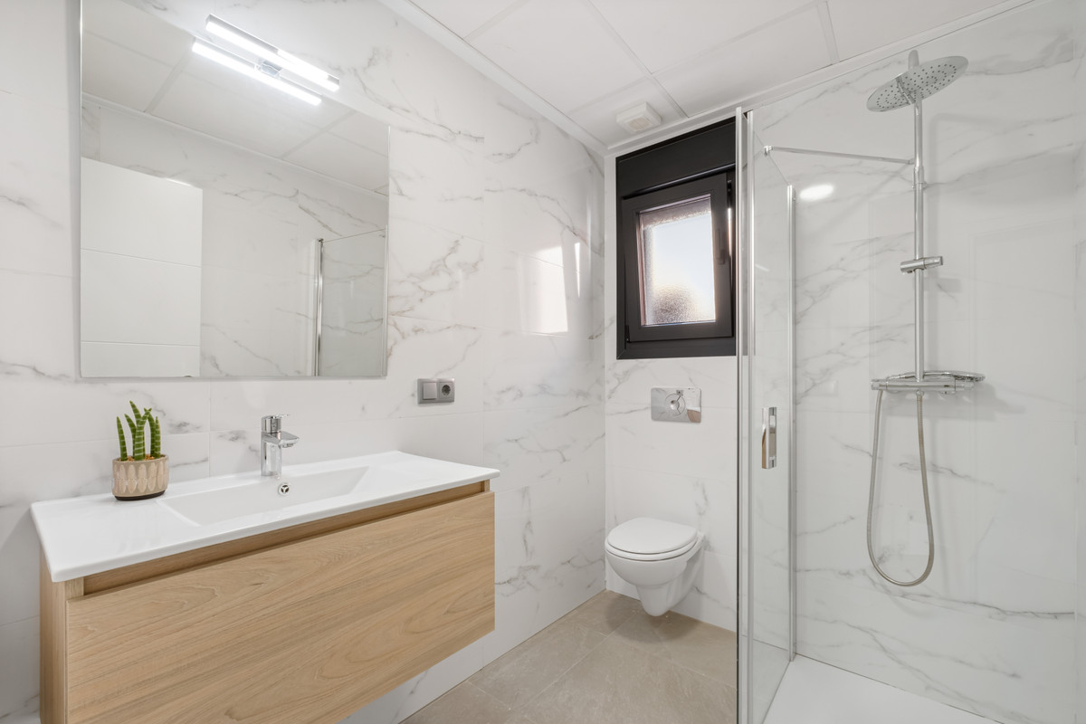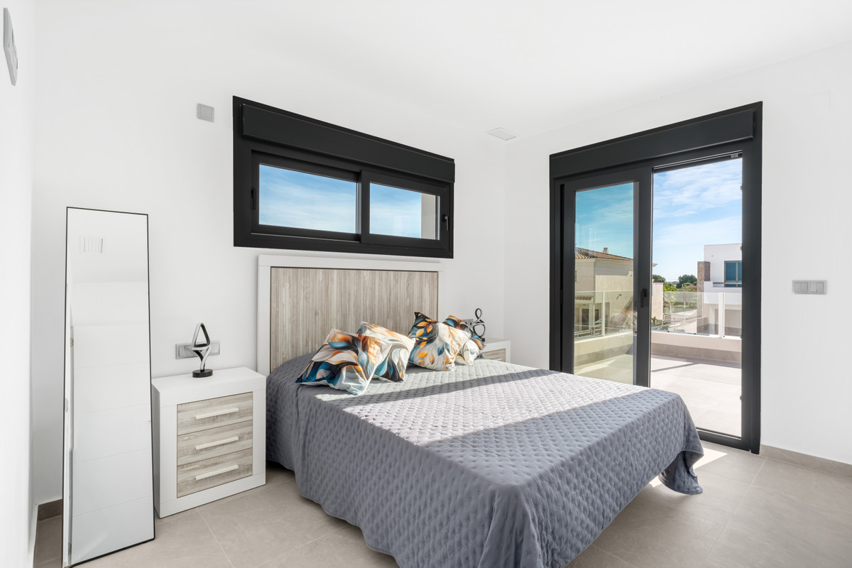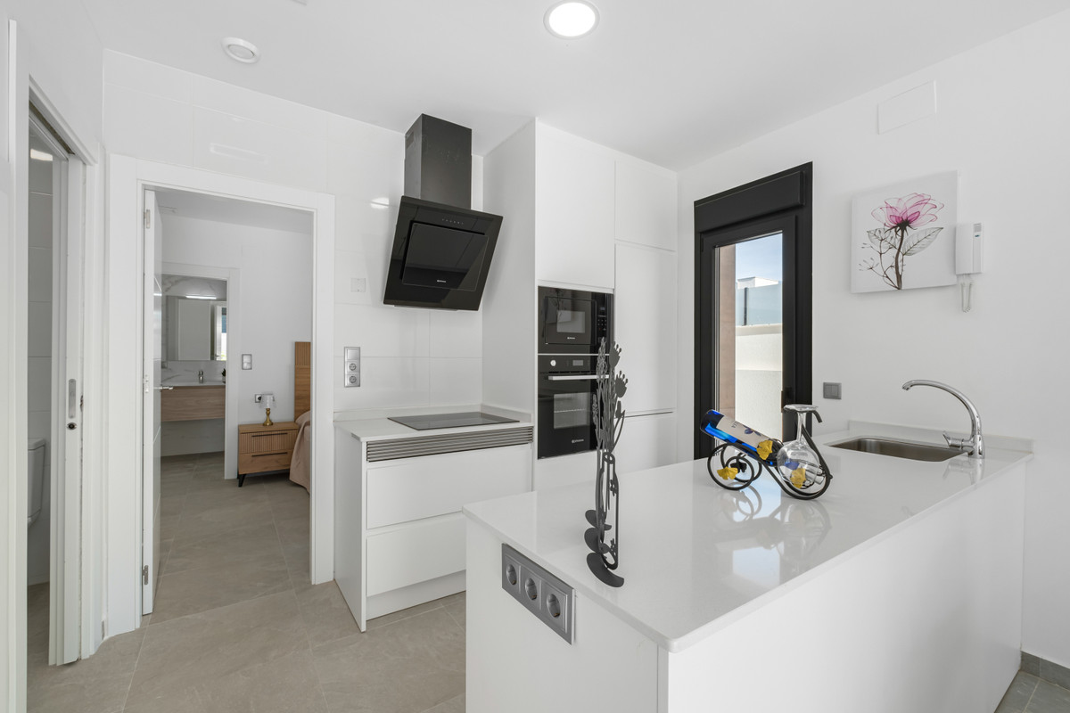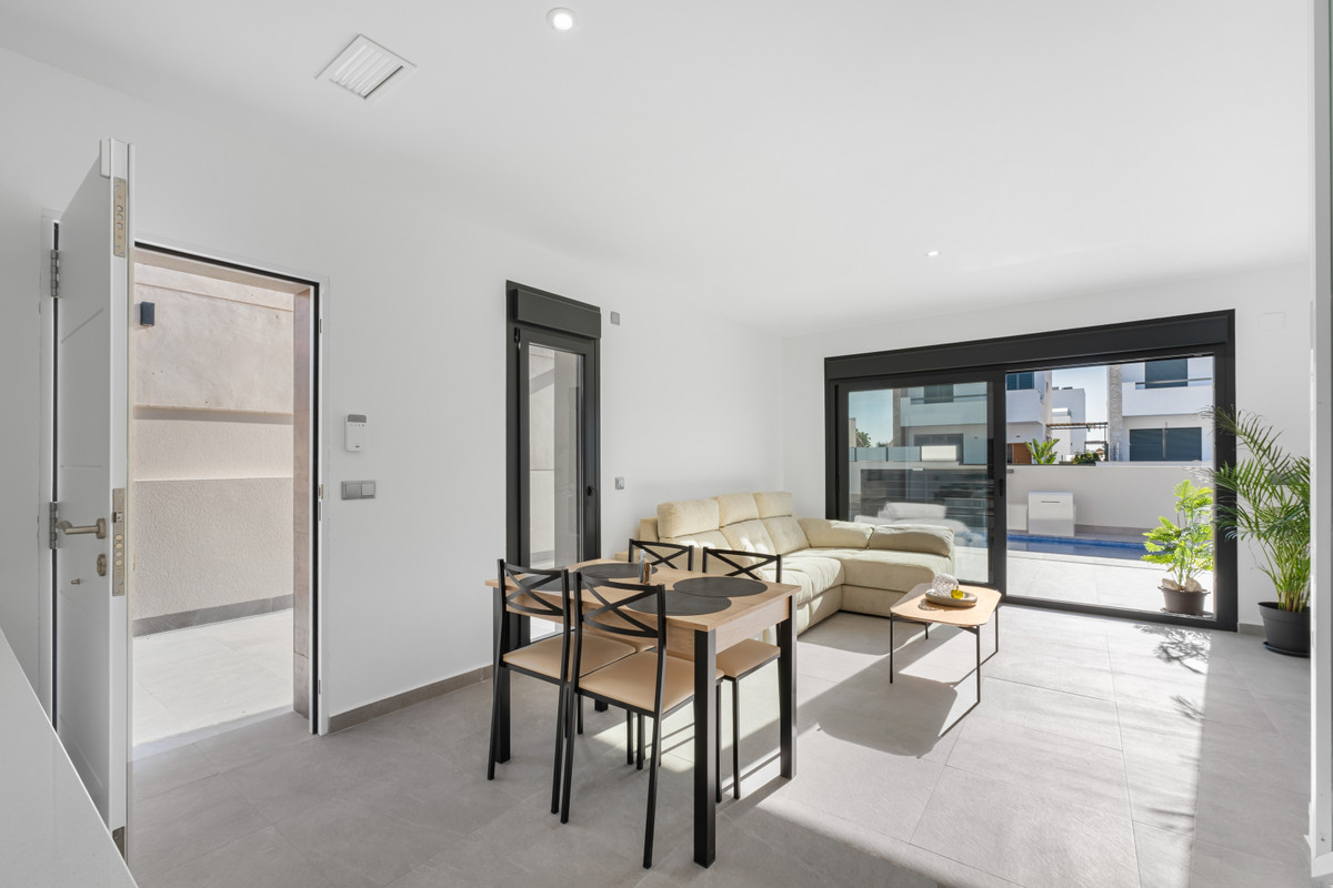 Nieuwbouw twee-onder-een-kapwoningen in het nieuwe deel van Daya Nueva. Slechts een paar minuten lopen naar het centrum van het dorp. 3 slaapkamers, 2 badkamers, privé dompelbad en terras van 18 m² met decoratieve watermuur. Woon-/eetkamer met open keuken, slaapkamer met inbouwkasten en en-suite badkamer op de begane grond. Op de eerste verdieping bevinden zich twee slaapkamers met inbouwkasten en een badkamer.