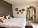 Op de begane grond bevindt zich één slaapkamer, één badkamer en één gastentoilet. Op de bovenverdieping twee slaapkamers en ook twee badkamers. De slaapkamers zijn voorzien van inbouwkasten.