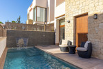 The exterior of the home is equally impressive. The private, fully tiled garden offers several seating zones, space for sun loungers, and a stunning swimming pool, all in a setting designed to provide complete privacy from neighbors. Additionally, the outdoor area includes a practical laundry room as well as extra storage space.
