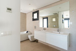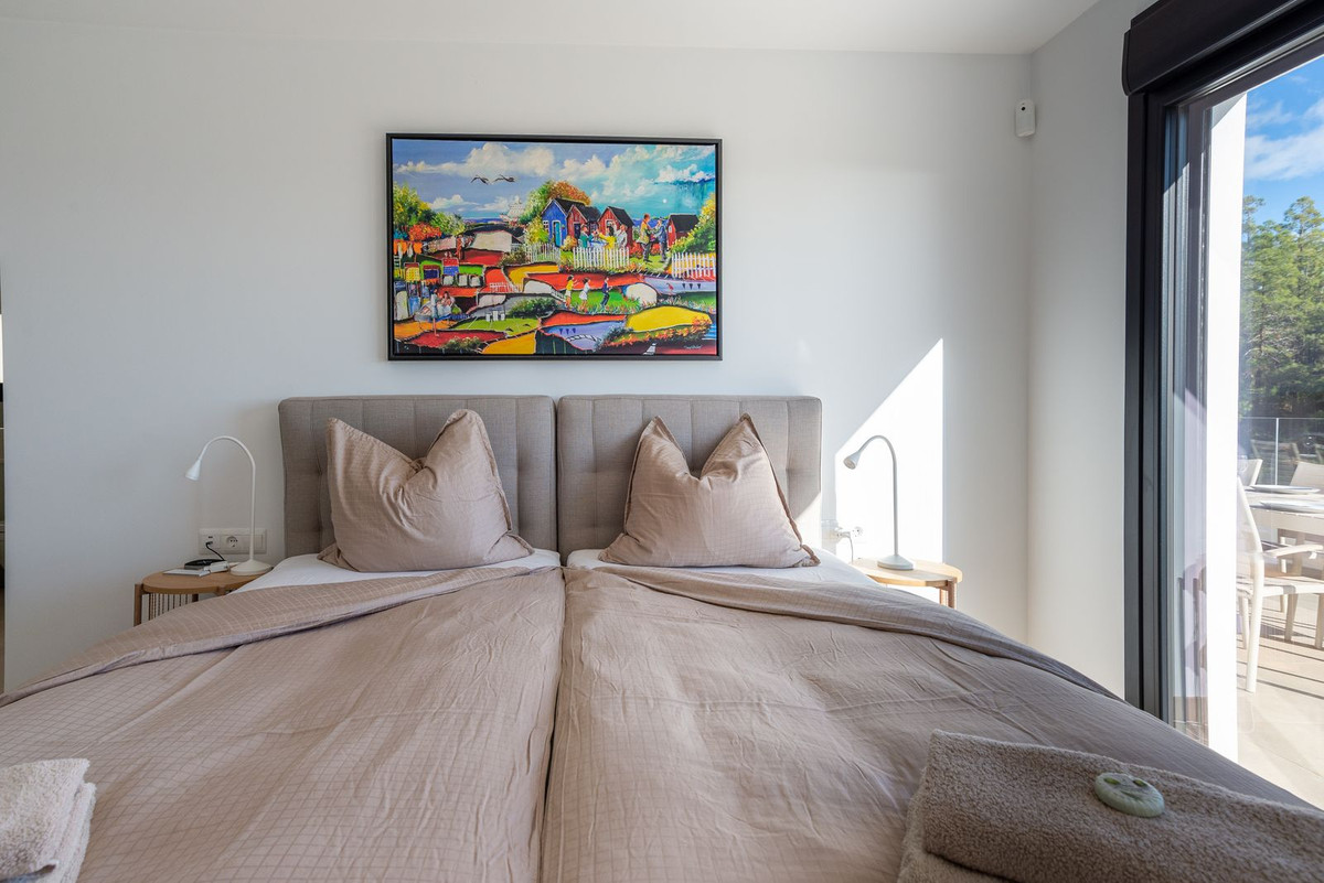 Op deze verdieping bevinden zich 2 slaapkamers, beide met toegang tot het terras/zwembad. 2 badkamers, beide met douche, waarvan één ook met ligbad.