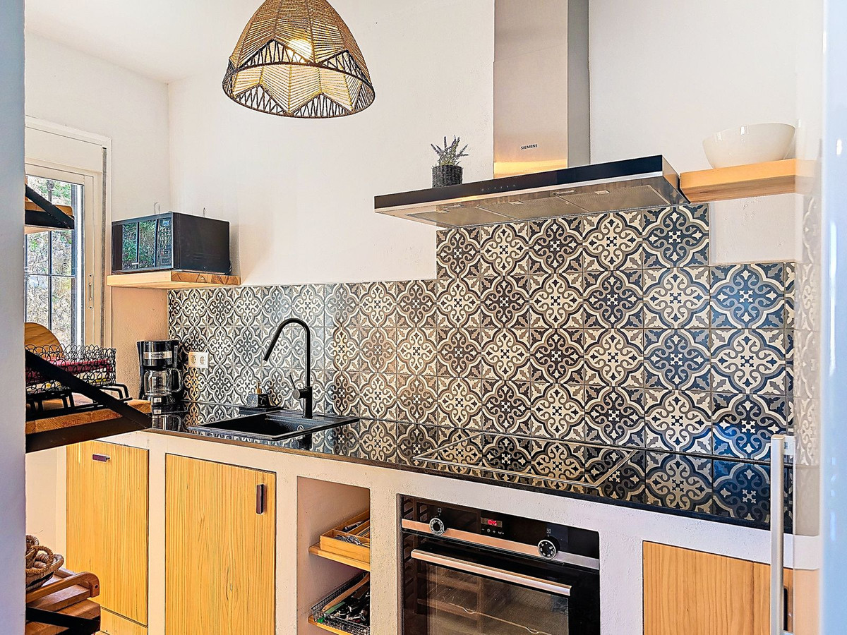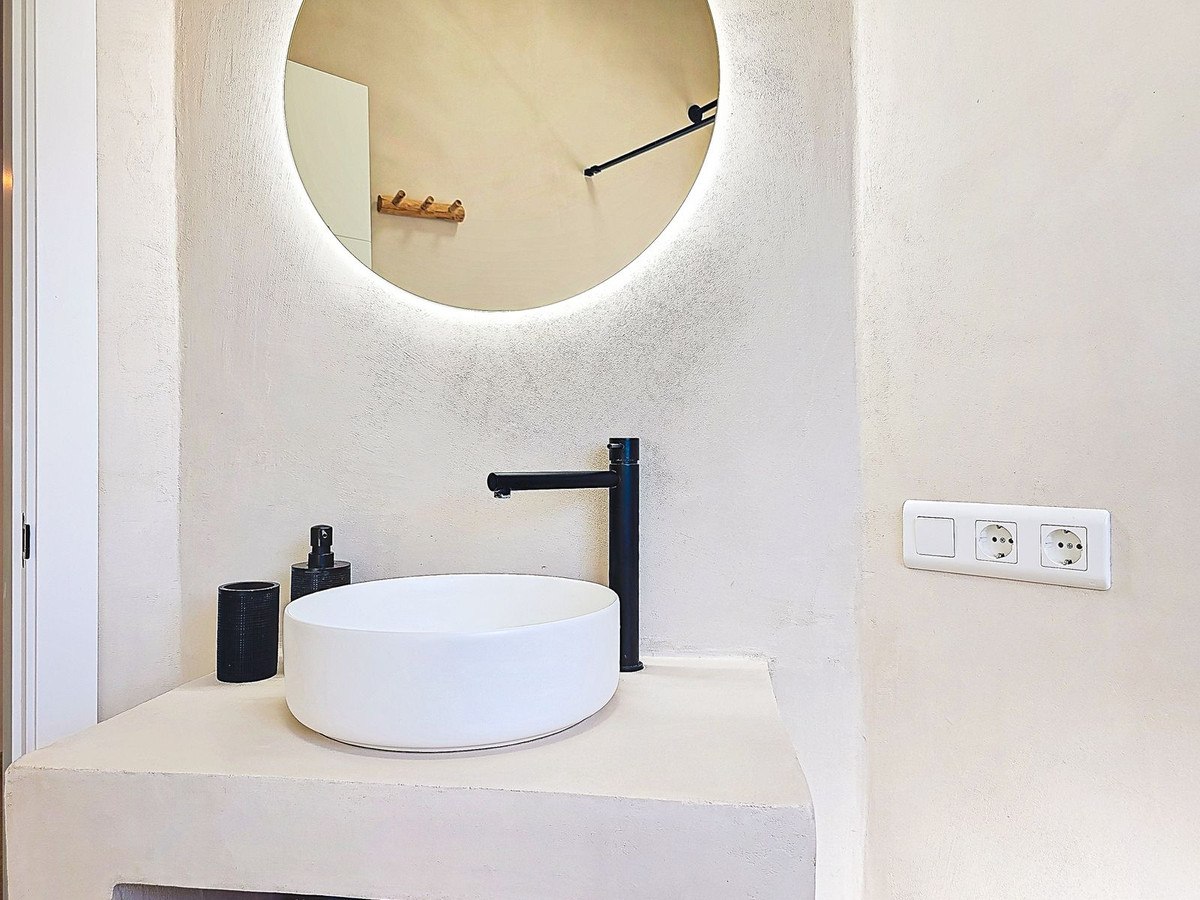 De villa heeft een woonoppervlakte van 94 m² en omvat drie slaapkamers, elk voorzien van airconditioning en ingebouwde kasten in Ibiza-stijl. Er zijn twee badkamers met open inloopdouches, waaronder één ensuite badkamer. De volledig uitgeruste keuken is eveneens Ibiza-stijl en beschikt over een koelkast, diepvries, keramische kookplaat, elektrische oven, microgolfoven en vaatwasser. De lichte woonkamer is voorzien van airco en een gezellig haardvuur, met directe toegang tot het ruime terras en het zwembad.