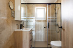 Inside, the property features a high-end designer kitchen with Neff appliances and Silestone countertops, marble flooring, air conditioning, a pellet fireplace, double-glazed windows, and a security entrance door for added peace of mind. Both bedrooms include fitted wardrobes, while the master bedroom benefits from a modern ensuite bathroom with a walk-in shower.