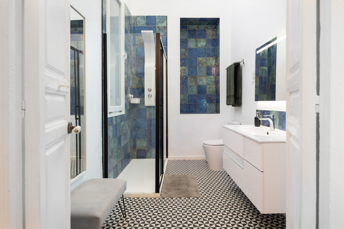 Indrukwekkende plafonds van 4,2 meter hoog met zichtbare balken, deuren van 3 meter en originele tegels uit de 19e eeuw vormen het fundament van een hoogwaardige renovatie die het erfgoed van het gebouw eert en tegelijkertijd het dagelijks comfort verhoogt. De badkamers in spa-stijl bieden royale afmetingen en regendouches; centrale airconditioning bedient de gehele woning. De veelzijdige indeling maakt een onafhankelijk studio of een appartement met drie slaapkamers mogelijk; momenteel functioneert het als een Airbnb, wat het ideaal maakt voor gasten of extra inkomsten als kortetermijnverhuur.
