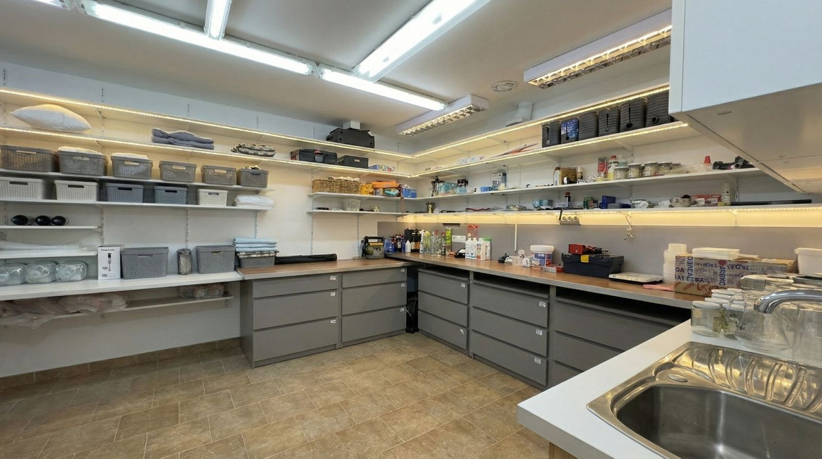 Een marmeren trap leidt naar de benedenverdieping. Hier vindt u een gastenappartement met en-suite badkamer en een eigen ruime keuken. Naast het gastenverblijf, via de enorme garage (55 m²!), bevindt zich een vierde slaapkamer die ook als kantoor kan dienen. Tevens bevinden zich op deze verdieping de technische ruimte (met zwembadpomp) en een opslag-/werkruimte van 30 m². Gezien de beschikbare ruimte en de aanwezige aansluitingen biedt deze verdieping volop mogelijkheden om 2 of 3 extra gastenkamers te creëren — ideaal voor het starten van een B&B.