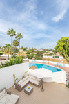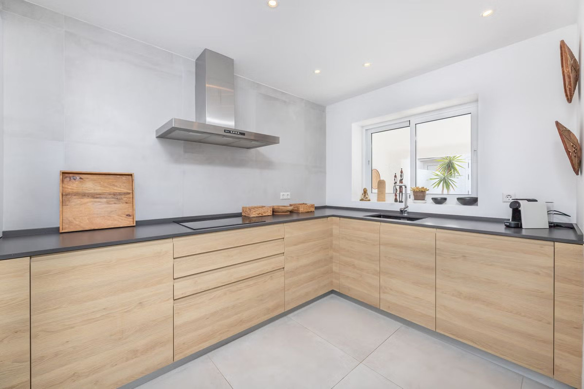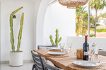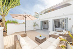 East Marbella, Elviria centre. For sale fantastic renovated and charming townhouse in Pueblo Sueco. This townhouse was refurbished to high quality standards in 2018 and beautifully decorated throughout. The property has a modern feel of top quality and is built over 2 floors. When entering the plot you will find an inviting west patio partially covered. It is furnished with chillout daybeds and there is lots of space for al fresco dining. There are mature types of spectacular cactus and easy maintaining planters. Entering the house you will find a handy guest toilet on the right and the fully equipped kitchen with all the necessary appliances. Also in the kitchen a cosy window to the front patio. The living room has large folding doors to the terrace, good space for two 3 seater-sofas and a nice round dining table next to the fire place. From the living room you access a lovely and spacious covered morning terrace with a 6 seater table, perfect to enjoy your breakfast! The stairs take you to the lower floor where we find a good sized bedroom with another auxiliary bedroom which could be used as dressing room. Another bedroom with a lot of extra space with a desk and dressing area. There are two bathrooms with generous showers, (one ensuite) and a washing/ storage room. These two bedrooms lead you to the patio on the lower floor from which you can access directly to the private pool club. At the patio you will find a beautiful deck where you can relax on the sunbeds and refresh using the solar shower. You can optionally be a member of the club for a yearly fee. There is Daikin hot and cold air conditioning system, underfloor heating in the bathrooms and high speed fibre optic. The neighbours are a combination of local and international nationalities. There is only a 10 minute walk to the best beach in Marbella, a 10 minute drive to Marbella city and less than 45 minutes to Malaga airport. There are as well several 18 hole golf courses like Santa Maria Golf, Santa Clara, Rio Real and Marbella Golf. Marbella has become a brand in Europe and all over the world with 320 days of full sun a year and total of 2900 hours of sun. Elviria represents the very essence of quality of life on the Costa del Sol. It is located in a unique natural setting and has a fantastic range of facilities nearby, including three 4-and-5 star hotels: Don Carlos, Marriott and Estrella de Mar, renowned golf courses such as Santa MarĂa and Green Hills, a Michelin-starred restaurant, Nikki Beach Club and one of the best beaches on the coast, all flanked by outstanding bars and restaurants, supermarkets and a local street market every Friday and an organic market every other Saturday. In addition, there is a Town Hall, doctor's office, post office, a wide range of schools, including private schools...all within walking distance. This is a unique opportunity and the ideal location for both a permanent residence or dream holiday home.