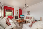 French doors lead into a sunken lounge, where large windows draw your eye towards the shaded terrace and gardens beyond. The spacious living room features a striking wood-burning fireplace, perfect for cozy winter evenings.