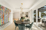 The home's interior is defined by light, flow, and precision. The layout has been carefully arranged to provide a sense of openness while maintaining privacy between the living areas and bedrooms. At the core of the property lies a Poggenpohl open-plan kitchen fitted with NEFF appliances, creating a space where design meets practicality. The kitchen extends into a spacious living and dining area that opens directly to the south-facing terrace, a perfect setting for outdoor dining and entertaining, complete with a built-in BBQ station. The west-facing terrace, accessible from both the master bedroom and the living room, offers an inviting lounge space where residents can enjoy the tranquil Mediterranean evenings and spectacular sunset views.