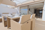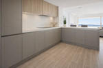 The main living area features a bright open-plan lounge and dining space with floor-to-ceiling sliding doors that open directly onto a private terrace, perfect for relaxing, entertaining or enjoying the Mediterranean climate all year round, with open views towards the golf course and surrounding mountains. A modern, fully equipped kitchen complements the living space, designed for both functionality and contemporary living.