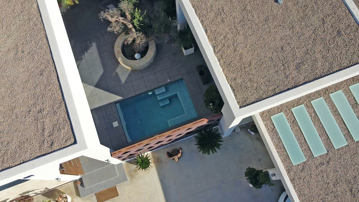 Beyond the secure gated entrance lies a stunning private courtyard — the true heart of the home. Here, a striking heated swimming pool doubles as a jacuzzi, creating a tranquil ambiance. A stylish seating area is framed by full-height glass walls that dissolve the boundary between indoors and outdoors, allowing natural light to flood the interior and creating a feeling of truly open plan living.