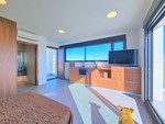 The villa features heated flooring throughout, vented air conditioning and heating as well as a log burner fireplace. An air filtration system removes dust and provides fresh and clean air throughout the property continuously. The kitchen cupboards open and close electrically, with a touch. The villa has its own high pressure water pump ensuring that the showers give a strong current throughout. Hand carved wooden doors and electric blinds and shutters feature throughout the property as well as industrial LED lighting which illuminates the home at night.