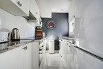 Modern fitted kitchen with serving window to terrace