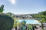Outside, the property has a main terrace with sea views and a built-in barbecue, plus steps leading to a rooftop terrace with even wider views, power sockets, and all-day sun. The garden wraps around the bungalow and is finished with low-maintenance astro turf. There is also an exterior storage cupboard and fibre optic internet installed. The community is gated and secure and the communal gardens are well kept and spacious, with a large communal swimming pool. A shopping centre with supermarkets, pharmacy, bars, and restaurants is about a 3-minute walk away, and the beach can be reached in under 10 minutes on foot. It is offered fully furnished and includes a private garage.