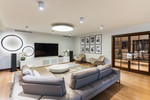 On the ground floor, there is a spacious, bright living room which connects to the dining room and a modern open kitchen, fully equipped with top-of-the-range appliances. Next to the entrance, there is a study, a walk-in wardrobe and a guest toilet.