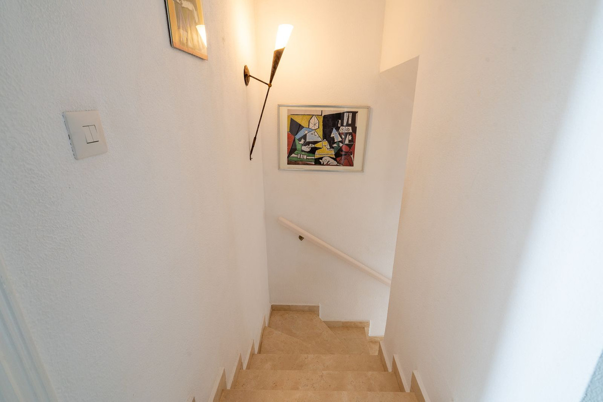 De buitenruimtes zijn ideaal om te ontspannen en gasten te ontvangen. Het grote voorterras biedt voldoende ruimte voor een eettafel voor zes personen en ligstoelen, terwijl het balkon op de bovenverdieping, toegankelijk vanuit beide slaapkamers, een weids uitzicht biedt over de zee en het zwembad. Een extra groot achterterras vangt de middagzon en is perfect om te ontspannen of praktisch te gebruiken, bijvoorbeeld voor het drogen van was.
