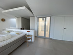A striking modern staircase crafted from metal, wood, and glass leads to the upper floor, dedicated to the impressive master suite. Here you will find a spacious bedroom with direct access to a second private terrace boasting spectacular panoramic sea views. The master level also includes a walk-in wardrobe, a luxurious en-suite bathroom, and a practical laundry and drying area.