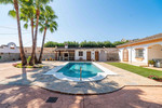 Set on a generous 1,400 sqm plot, the property is fully enclosed and accessed through automatic gates for privacy and security. The landscaped garden features mature palm trees, a private swimming pool with an outdoor shower, a barbecue area, and ample spaces for sunbathing and entertaining. A 40 sqm covered terrace/porch provides a shaded retreat overlooking the pool and gardens.