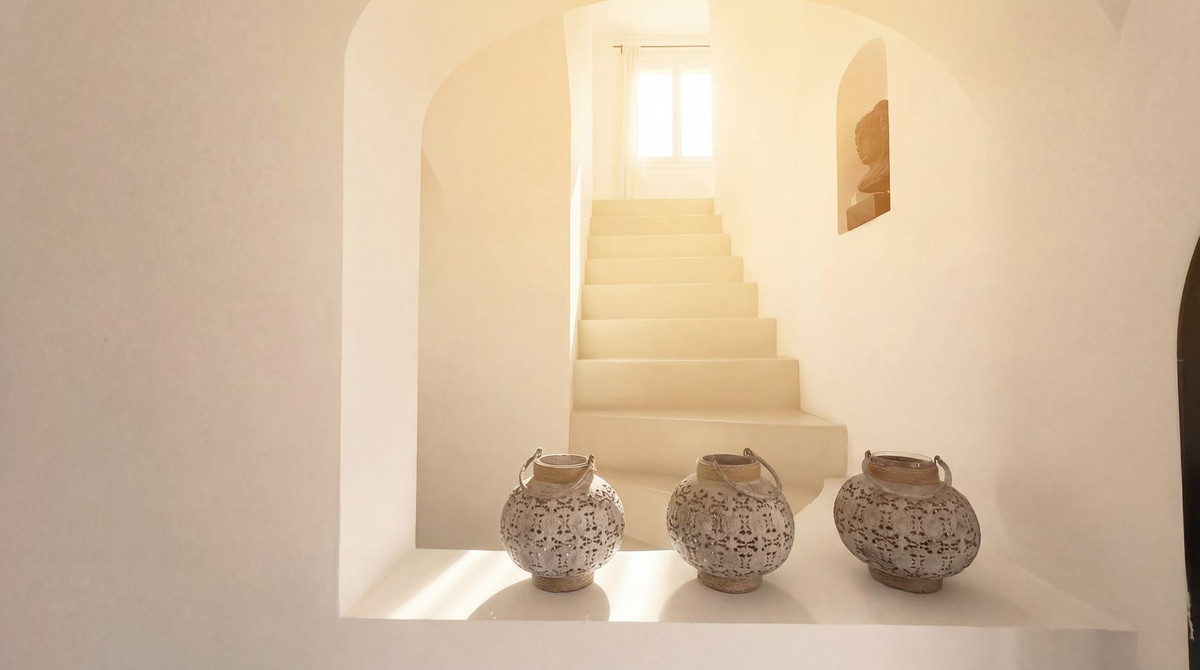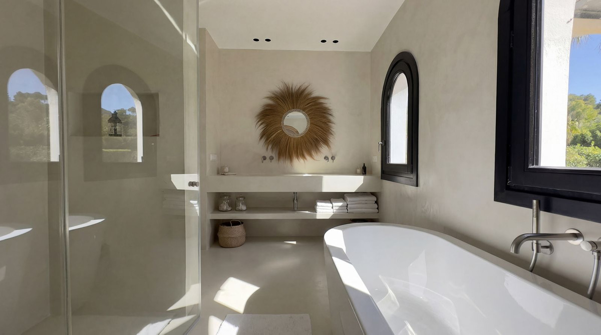 Uw reis naar huis voert u over de karakteristieke bosweg van de Barranco Blanco, direct omringd door de heilzame geur van pijnbomen en wilde tijm. U passeert de imposante poort en rijdt eerst langs uw eigen omheinde tennisbaan en langs het volledig vrijstaande gastenverblijf, dat op gepaste afstand van de hoofdvilla is gesitueerd. Zo genieten zowel u als uw gasten van volledige discretie. De villa zelf is volledig naar Noord-Europese maatstaven gerenoveerd, met materialen van de hoogste kwaliteit (waaronder vloeren van microcement), en biedt bij binnenkomst direct het comfort van vloerverwarming op de begane grond.