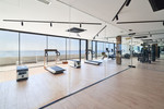 Fitnessruimte met Technogym-apparatuur en frontaal zeezicht