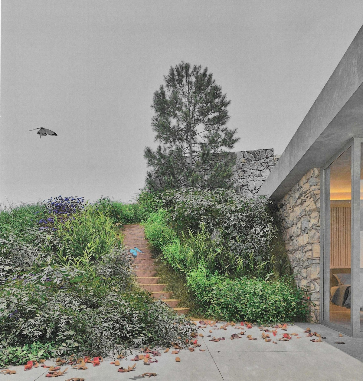 De binnenruimtes openen vloeiend naar het landschap via grote schuiframen van glas, waardoor een naadloze overgang tussen binnen en buiten ontstaat. Het ontwerp legt de nadruk op privacy, licht, textuur en integratie met het hellende perceel.