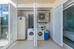 Het hart van de woning is de ruime woonkamer met open keuken, een moderne en functionele ruimte uitgerust met Siemens-apparatuur en een Silestone werkblad, perfect om zowel dagelijks te genieten als om gasten te ontvangen.