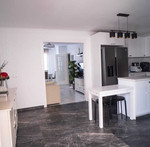 We access through an entrance porch with the possibility of building a pool. Inside we find a bright 25 m² living-dining room, a modern open kitchen with an island, a rear patio, laundry area and a full bathroom.