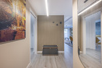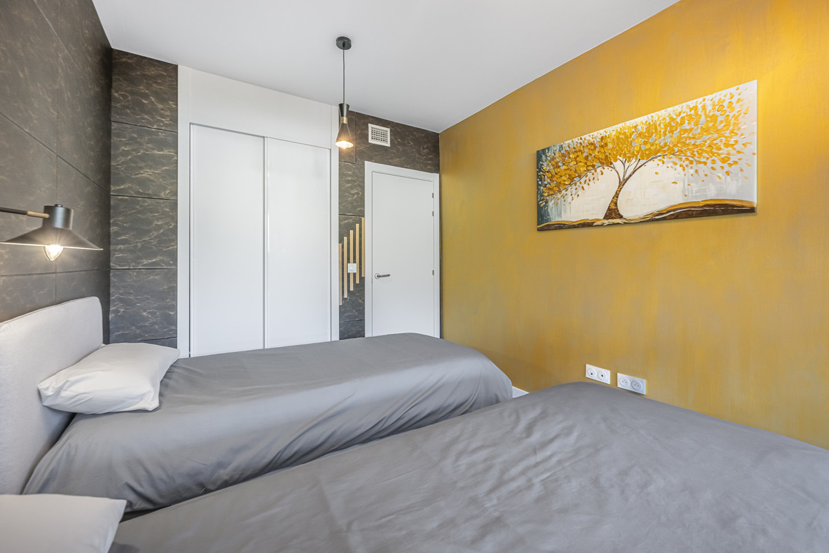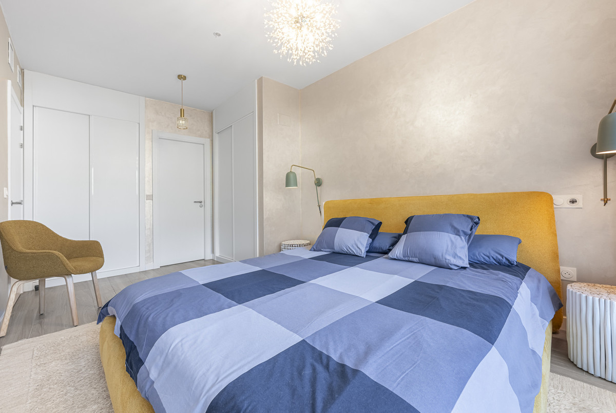 The apartment is thoughtfully designed with attention to detail, featuring high-quality interior design elements. The living room includes custom-made furniture that incorporates a television and a modern electric fireplace. Sliding doors provide a pleasant separation between the bedroom and living area, while modern kitchen upgrades and lighting in all rooms ensure comfort and functionality. The bedrooms are spacious and come with built-in wardrobes, and floor-to-ceiling windows allow the rooms to be filled with natural light. The apartment is offered fully furnished, including lighting, bed linen, towels, dishes, glasses, and other everyday essentials. All necessary household appliances are included, from a dishwasher to a microwave, toaster, vacuum cleaner, and coffee machine.