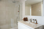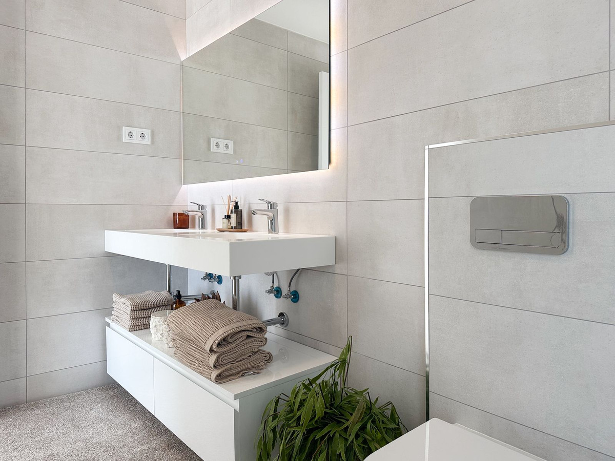 Het appartement beschikt over een lichte en ruime woonruimte die naadloos overgaat in de open keuken, uitgevoerd in een elegante, minimalistische stijl en voorzien van geïntegreerde apparatuur. Grote raampartijen laten overvloedig daglicht binnen en creëren in de hele woning een warme en aangename sfeer.