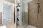 Bathroom: Stylish bathroom with underfloor heating, walk-in shower, washbasin, toilet and storage. In this bathroom you will also find a washing machine and dryer.