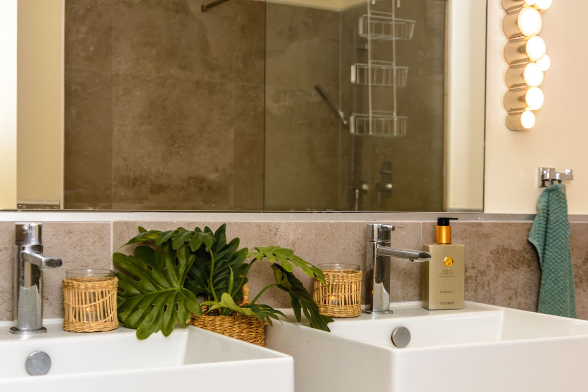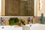 Ensuite bathroom: Elegant design with underfloor heating, double washbasin, large walk-in shower, bathtub, toilet and storage.