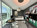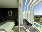 The upper floor hosts a bright and versatile fifth room, currently used as an office, with a separate bathroom and access to a generous rooftop terrace. From here, panoramic views extend over the golf course and towards the sea, making it an ideal space for outdoor dining, relaxing or the installation of a private spa.
