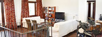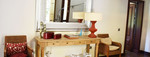 The fully fitted kitchen is equipped with modern appliances, including fridge, microwave and dishwasher, and features a long wooden worktop that also serves as a breakfast table. Adjacent to the kitchen is a second living room or TV lounge, providing an additional comfortable relaxation area. This level also includes the master bedroom, with very large walk-in wardrobes and an impressive spa-style bathroom with a round bathtub, as well as another bedroom with en-suite bathroom and a convenient laundry room.