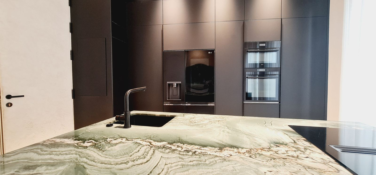 Open-plan American kitchen, spacious living room, large walk-in closet
