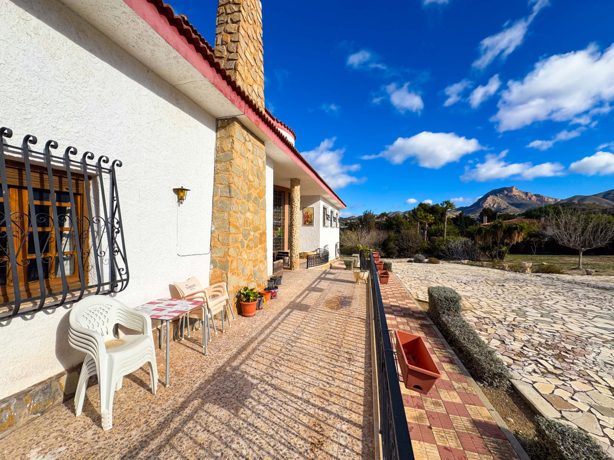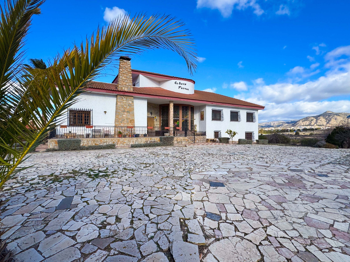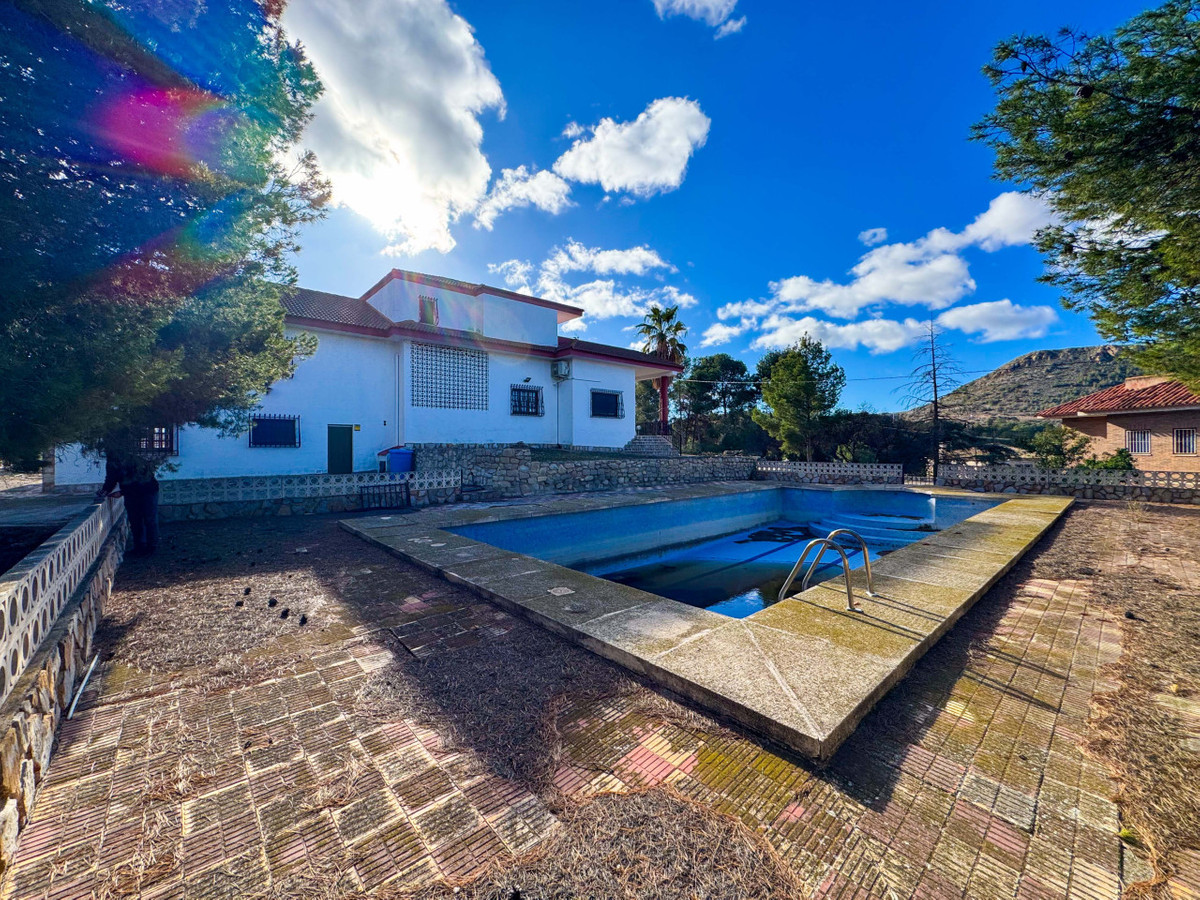 Ruime mediterrane villa gelegen tussen de prestigieuze woonwijken Las Salinetas en Loma Bada, Elda/Petrer, met 5 slaapkamers, privézwembad en prachtige open uitzichten op de bergen, slechts 1 km van het centrum van Elda en ongeveer 20 minuten van Alicante en haar stranden. Een uniek pand dat ruimte, privacy en natuur combineert met uitstekende verbindingen en nabijheid van alle voorzieningen.Het landgoed bevindt zich op een uniek perceel van ongeveer 5.200 m², een type grond dat tegenwoordig moeilijk te vinden is omdat het bouwen van woningen van deze omvang in de omgeving niet is toegestaan. Het perceel is verdeeld over verschillende niveaus en biedt een tuin, grote terrassen, een privéboomgaard, een aangename dennenbos met ongeveer 60 dennenbomen die natuurlijke schaduw en privacy bieden, evenals een klein voetbalveld ideaal voor gezinsplezier. Er zijn ook twee wateraansluitingen om het onderhoud buiten te vergemakkelijken.Buiten valt een groot zwembad van 14×7 m op, aangelegde gebieden, een overdekte carport met plaats voor maximaal vier voertuigen en een charmante barbecueplek perfect voor bijeenkomsten in de buitenlucht. De onderste verdieping herbergt bijruimtes zoals een zomerse keuken, wijnkelder, opslag, buitenbadkamer en verschillende opslagruimtes.Het hoofdgebouw van ongeveer 350 m² biedt een ruime en lichte indeling, met alle kamers aan de buitenkant en een bevoorrechte oriëntatie. Het interieur beschikt over een statige entree met een elegante gebogen trap van massief hout en marmeren treden, een grote woonkamer, eetkamer met open haard en een loungegedeelte ideaal voor familie- en sociale bijeenkomsten. Het heeft ook een aparte keuken met directe toegang tot de semi-kelder en meerdere opslagruimtes.Het huis heeft vijf slaapkamers, waarvan één en suite, allemaal met inbouwkasten en houten deuren die warmte en karakter geven, evenals verschillende extra badkamers die de woning compleet maken. Op de bovenverdieping is er een zithoek, een extra slaapkamer met een complete badkamer en toegang tot een solarium van ongeveer 30 m² met open uitzicht.Het pand vereist renovatie en biedt grote mogelijkheden voor update en personalisatie, hoewel het momenteel direct bewoonbaar is. Het beschikt over elektriciteit, water en een septic tank, en doordat het op stedelijk terrein ligt, biedt het meerdere opties voor verbetering en aanpassing.De locatie is uitstekend, met snelle toegang tot de A-31 snelweg binnen enkele minuten, slechts 5 minuten van alle lokale voorzieningen, 1 km van het centrum van Elda en ongeveer 15 minuten van de prestigieuze La Alenda Golf Club.Aarzel niet om contact met ons op te nemen voor meer informatie of om een bezichtiging te regelen.