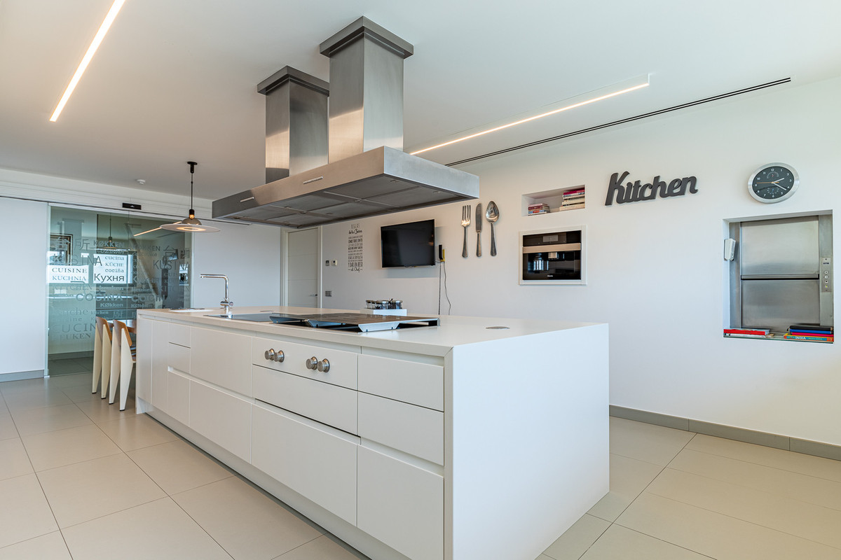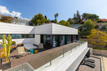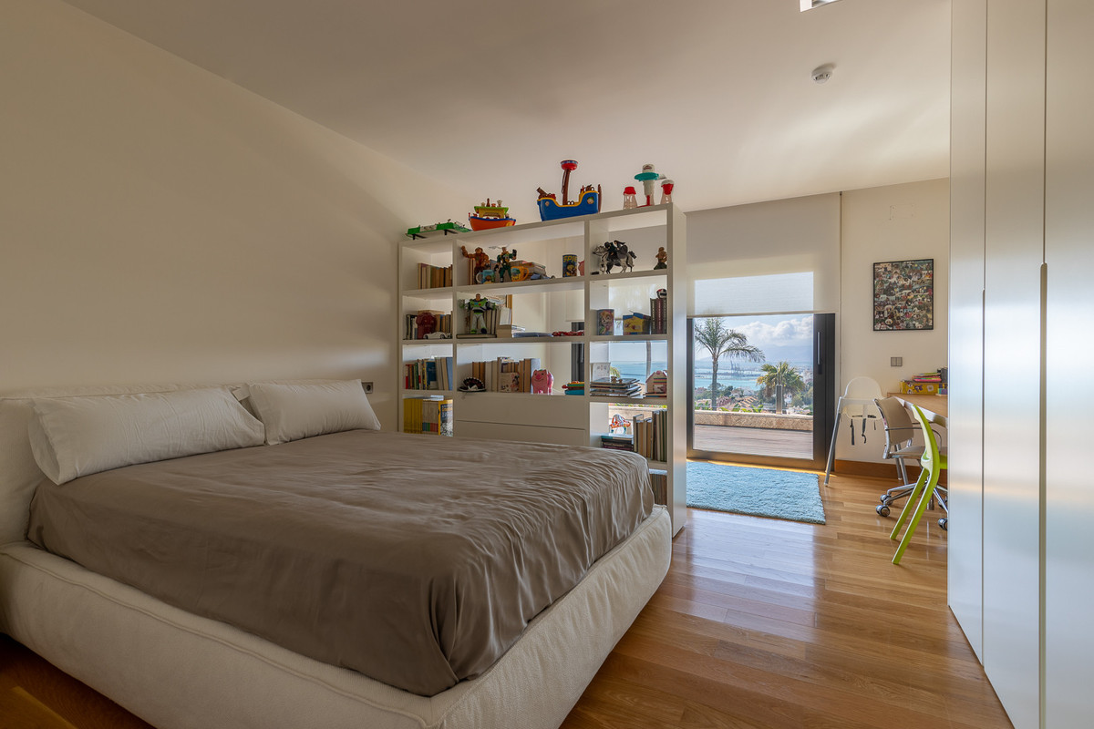 This luxury designer villa is situated in an exclusive and private area of Parque Clavero and offers, without a doubt, the best views of the whole Bay of Malaga. The property is set on a massive plot of 5023 m2 and is distributed over 4 levels connected by a lift. Stepping into the house you are immediately struck by its flawless design, well-thought-out features and open spaces that blend perfectly with the incredible panoramic sea views on the horizon. The ground level of the villa with access to the garden consists of games and barbecue area that features a dumbwaiter connecting directly to the kitchen. The upper level with access to the pool area comprises wine cellar, fully-equipped gym, jacuzzi, sauna, Turkish bath, and a dressing room. The first floor welcomes you into a spectacular living room offering breathtaking panoramic sea views, dining area and state-of-the-art kitchen with an island. Furthermore, on this level are 4 en-suite bedrooms, laundry room and service apartment with two bedrooms, lounge and a bathroom. The second floor houses an office room with access to the solarium and en-suite master bedroom that includes walk-in closet and opens onto a vast terrace. The outdoor area features an extraordinary infinity saltwater swimming pool with waterfall, decking area with sunbeds and spectacular huge garden that stands out for its ecological orchard, tropical trees and a vegetable patch. This high-end house with all possible kinds of modern comforts comes for sale in an excellent condition and has everything you can expect from a genuinely luxury house. The property is well-communicated with the city centre and is located within only 15 minutes' drive from Malaga International airport.