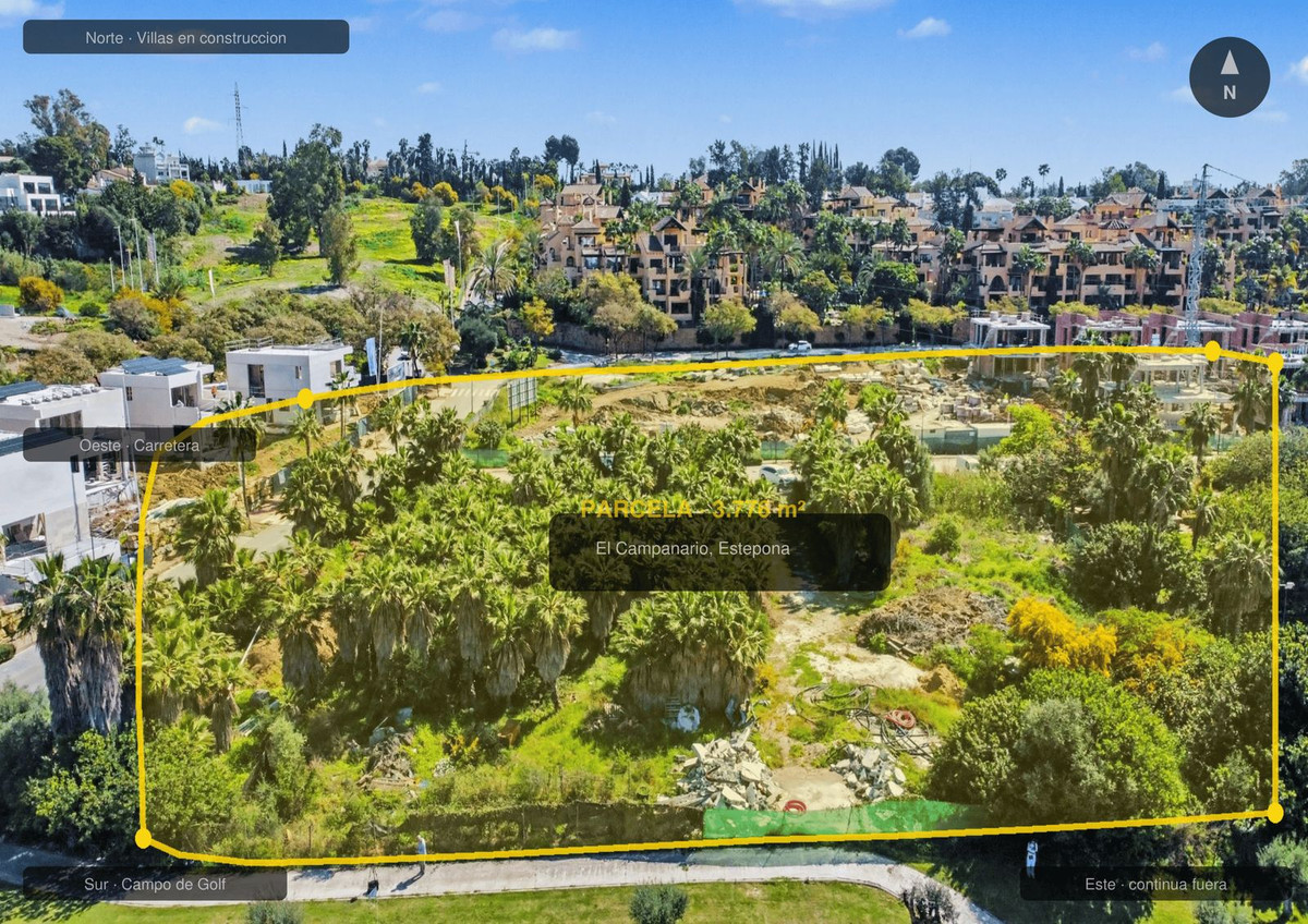 Golf-Front Plot at El Campanario, Estepona 3,776 m² | Private Cul-de-Sac Corner | Panoramic Views | South-West Facing This plot represents a magnificent investment opportunity in one of the most privileged locations on the Costa del Sol: front-line to El Campanario Golf Course, in the heart of Estepona's New Golden Mile. **The Plot and Its Immediate Surroundings** Spanning 3,776 m², the plot occupies a unique cul-de-sac position, affording exceptional privacy and virtually no through traffic. As clearly visible in the aerial photography, the western boundary sits in direct contact with the golf course, whose immaculate fairways, centuries-old olive trees and tropical palms unfold literally at the foot of the land. The south-west orientation ensures abundant afternoon sunlight and unobstructed open views across the greens. The plot is home to a dense and lush Mediterranean and subtropical landscape, with mature Washingtonia palms of impressive stature that lend the site a singular botanical character. This existing vegetation could be strategically integrated into any high-end landscaping and architectural project. **A Neighbourhood in Full Transformation** The aerial images clearly capture the intense development activity surrounding the plot: completed contemporary villas with private pools and solar panels, new residential projects under construction, active cranes and high-end developments underway. El Campanario is experiencing one of the most dynamic investment moments anywhere on the Costa del Sol — and this plot sits at the very epicentre of that transformation. From the site, the panoramic views take in an exceptional landscape: to the north, the imposing silhouette of the Serranía de Ronda mountains; to the south, glimpses of the Mediterranean shimmering between the rooftops; and in the foreground, the perfect green carpet of the golf course flanked by luxury villas and ancient trees. The club's sporting facilities — clay tennis courts, golf course and landscaped gardens — are clearly visible from the plot, reinforcing the exclusive country club character of this setting. **A Blank Canvas for Premium Development** The plot's planning flexibility opens the door to two major development paths: **Option A — Mixed Commercial and Residential Use** Up to 2,000 m² of buildable area, divided into 1,200 m² for commercial use and 800 m² for residential. An ideal combination for a project blending exclusive amenities with luxury residences, perfectly aligned with the profile and expectations of the clientele this premium environment attracts. **Option B — Luxury Hotel Resort** A hotel development of 2,000 m² built area, with the possibility of extending by a further 25%, reaching a total of 2,500 m². An exceptional opportunity to create a boutique hotel or luxury resort on the golf front line, in one of Europe's most sought-after tourist destinations. **An Unrivalled Location on the New Golden Mile** El Campanario Golf & Country Club, designed by renowned Spanish professional golfer Manuel Piñero, offers members and guests a Mediterranean restaurant, spa, gym, heated pool, padel and tennis courts, and a country club atmosphere that is hard to match anywhere on the Costa del Sol. Combined with outstanding connectivity to Estepona, San Pedro de Alcántara, Marbella, Puerto Banús and Málaga Airport — all within 30 minutes — this plot stands as a truly first-class investment asset.