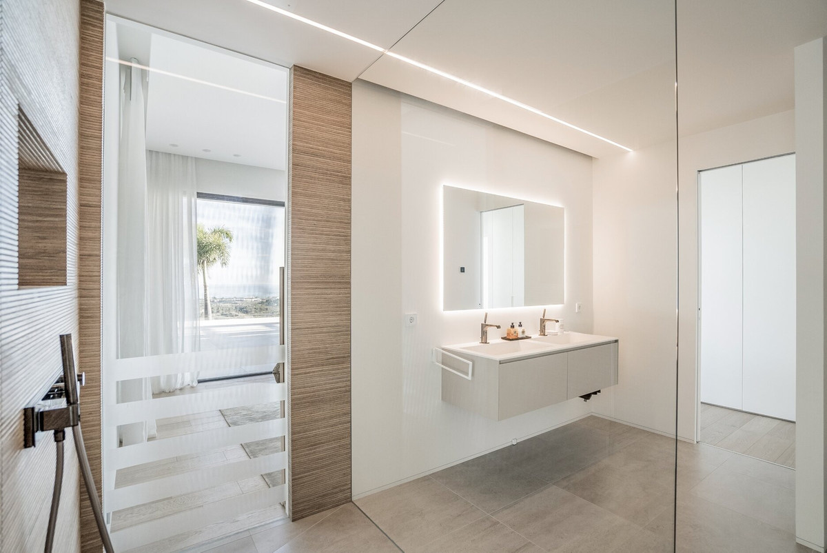 As you step into the living room, you are immediately struck by the grandeur of the space. The soaring ceilings, reaching an impressive height of 8-10 meters, create a sense of openness and airiness. Natural light floods the room from the huge windows that stretch from floor to ceiling, showcasing breathtaking panoramic views of the sea and the surrounding landscape. The living room seamlessly integrates with the terrace space, blurring the boundaries between indoor and outdoor living.