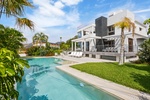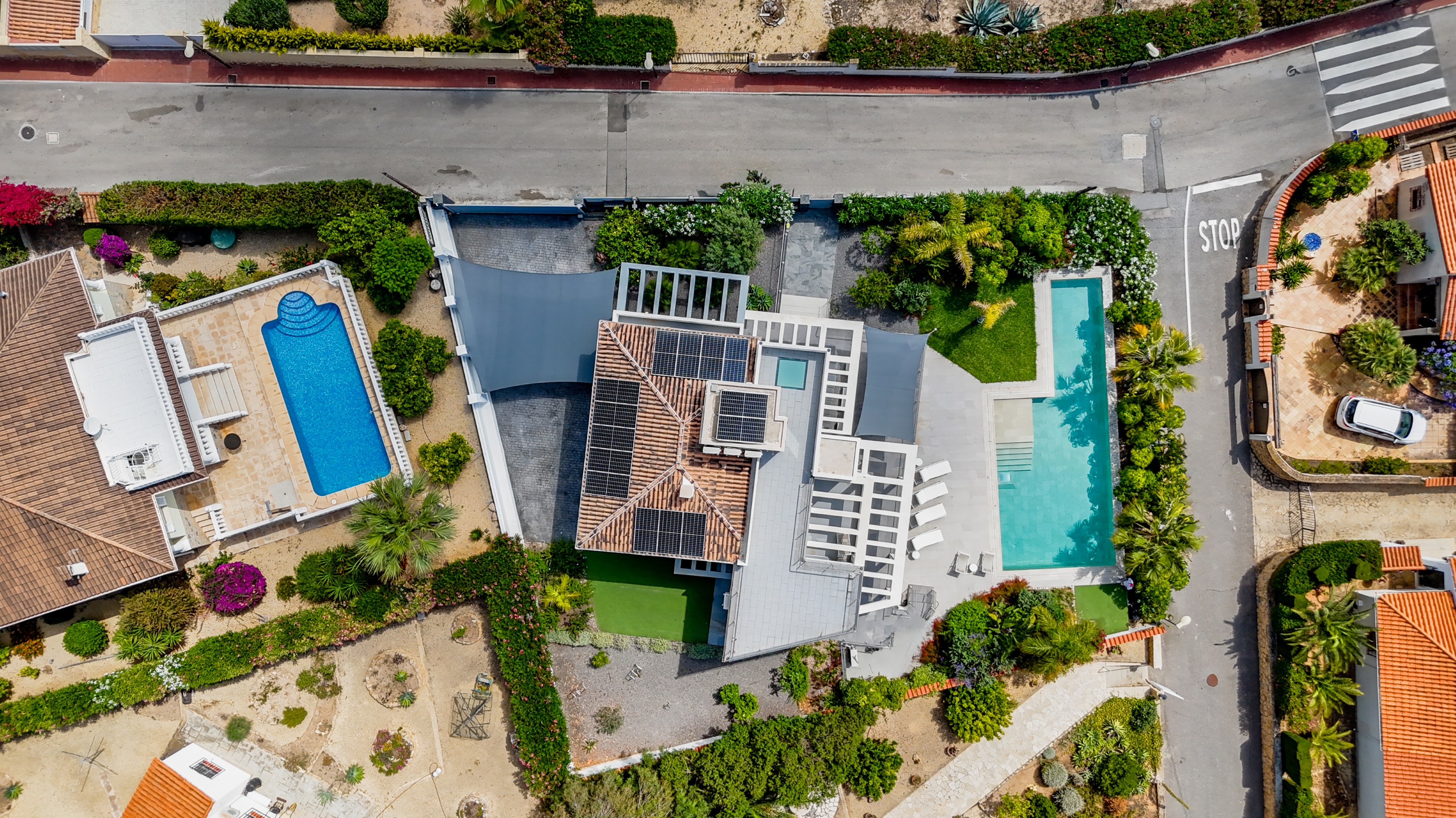 Groot verwarmd zwembad omgeven door zon- en schaduwterrassen