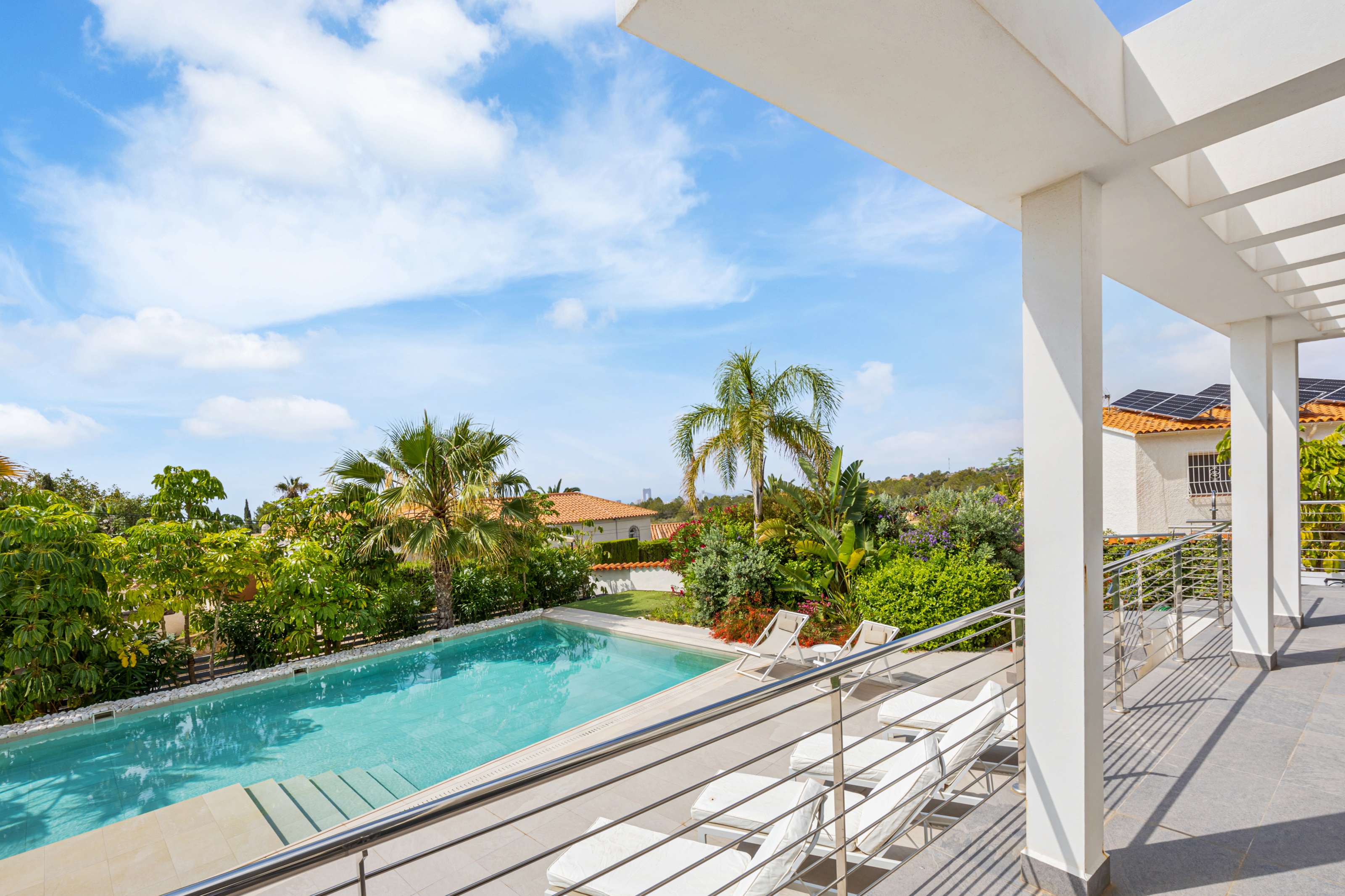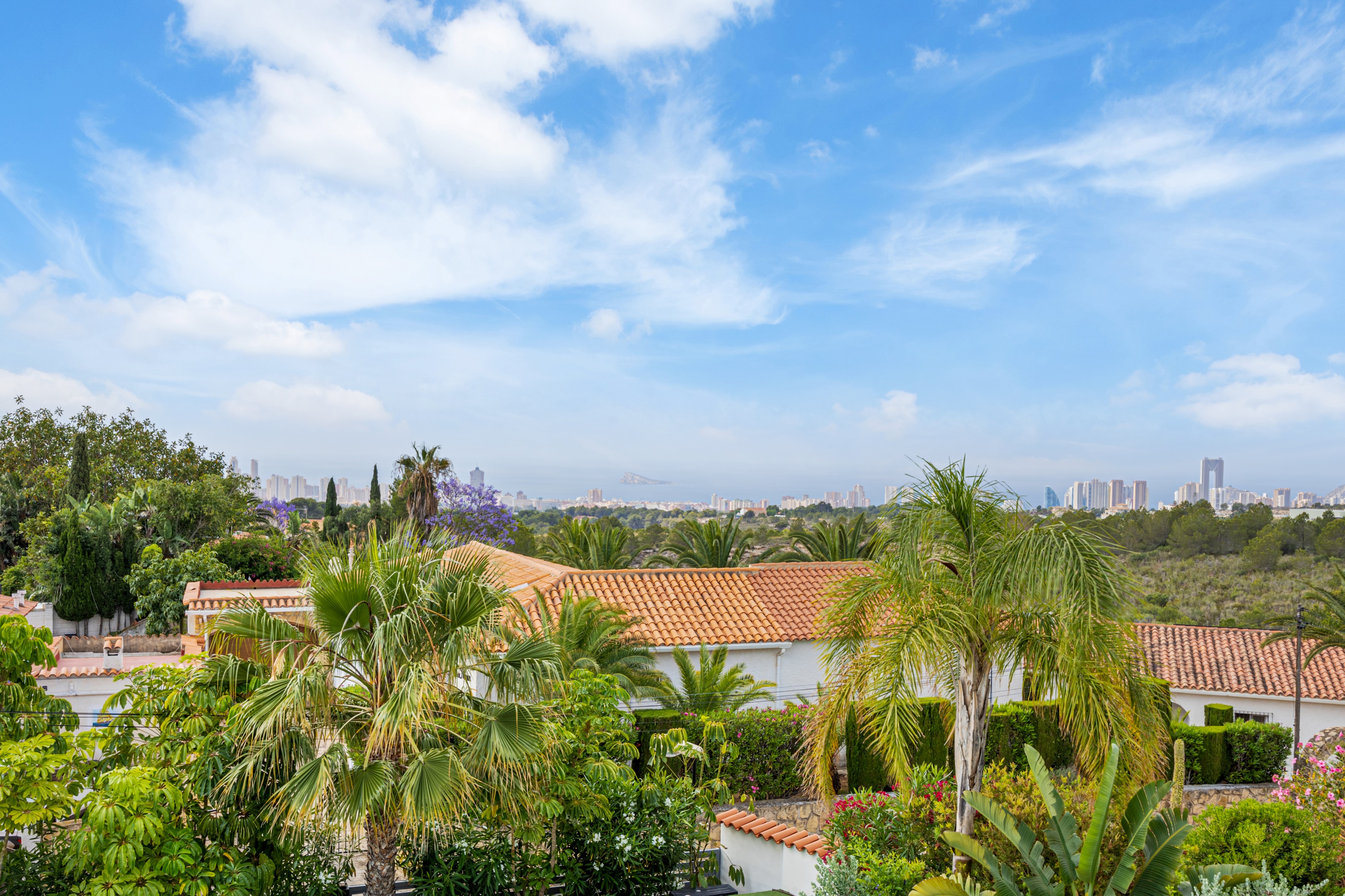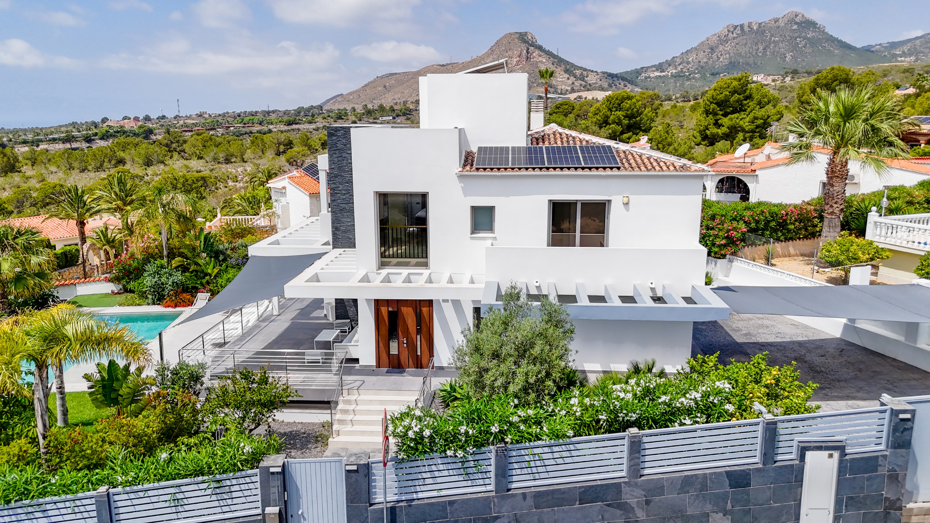 Een zeldzame kans om de enige villa in moderne stijl te bezitten in deze rustige buitenwijk van La Nucía, waarbij geavanceerd design wordt gecombineerd met comfort, efficiëntie en een prachtig uitzicht op zee, de bergen en de skyline van Benidorm.