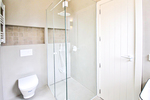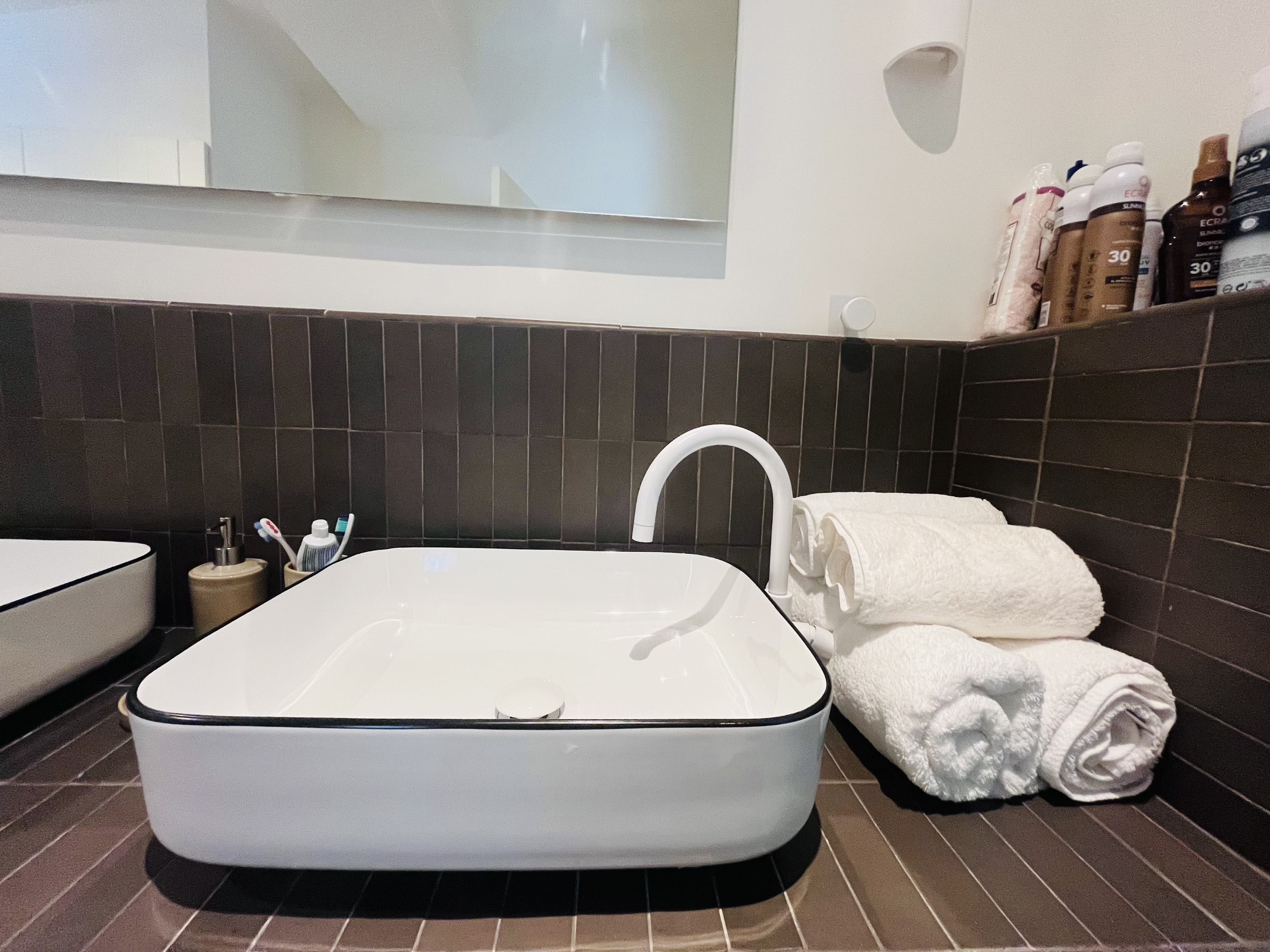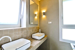 Luxe afwerkingen: Italiaanse Marazzi vloeren, microcementbadkamers, porseleinen antislipvloeren van Mirage, Roca sanitair, Tres kranen, textielmelamine kasten