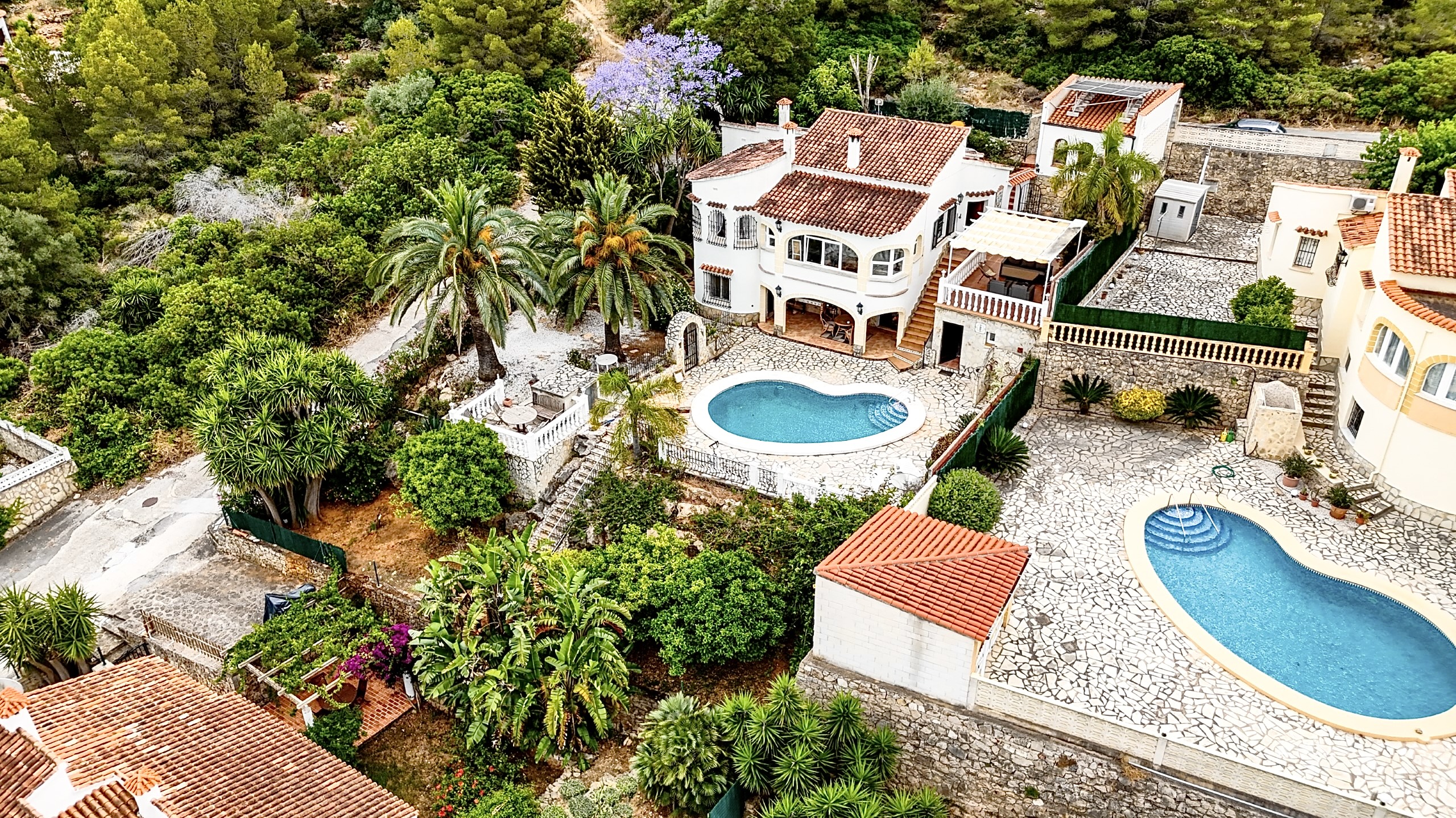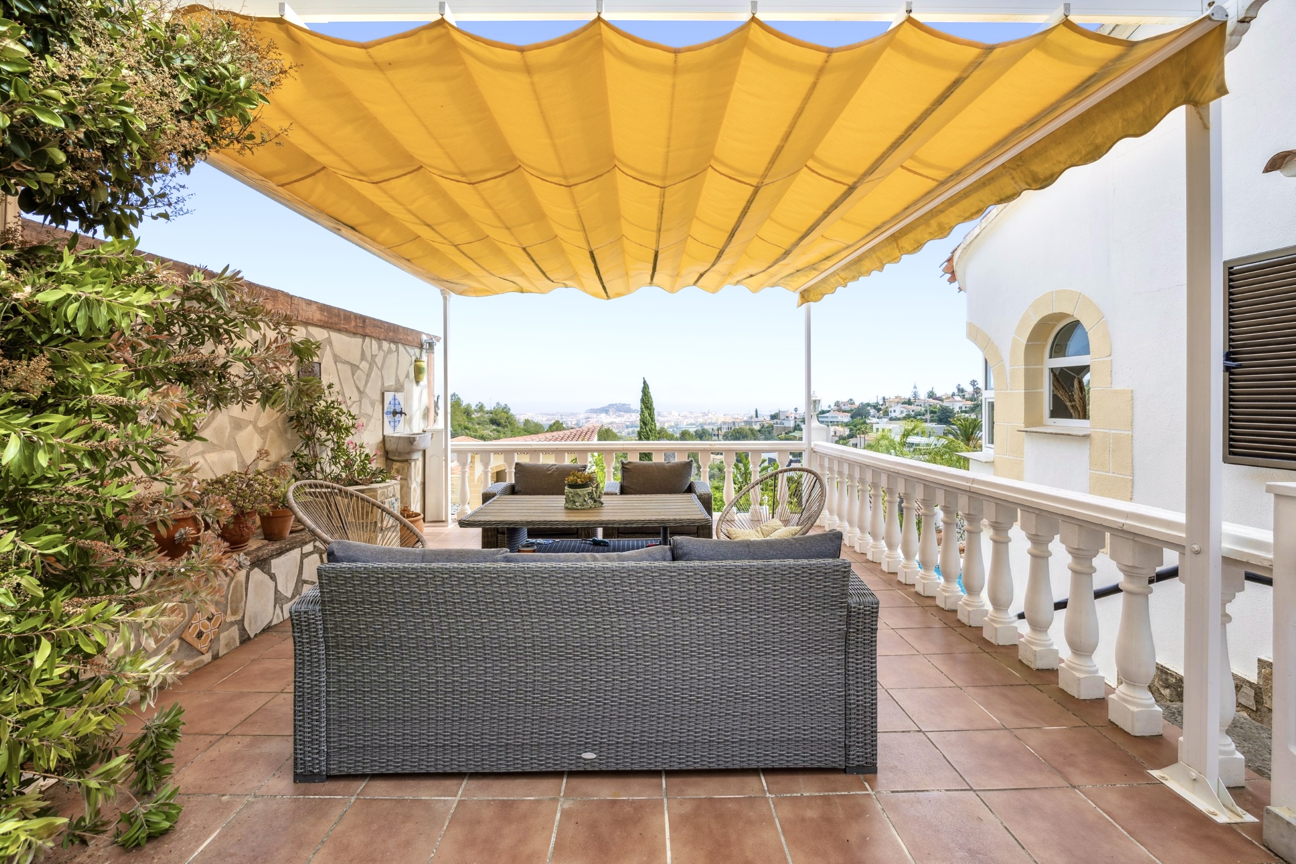 Buiten vindt u een zonovergoten zwembad, een stenen barbecue, verschillende terrassen om te loungen of te dineren, en een volgroeide mediterrane tuin met sinaasappel-, citroen- en mandarijnbomen – uw privéoase in de bergen.