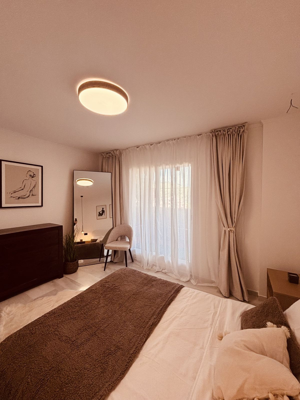 Hoofdslaapkamer: Beschikt over een elegante en-suite badkamer en directe toegang tot het terras.