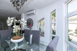 We are proud to present this detached villa located in the prestigious residential area of Lomas de Don Juan, close to Cabo Roig and the renowned beaches of Campoamor and La Zenia. This stunning single-level property has been elegantly renovated to the highest standards, combining contemporary luxury with the charm of its original Mediterranean character.Set on a generous 1,300 m² private plot, the villa offers a total built area of 344 m², surrounded by beautifully landscaped, low-maintenance gardens and complete privacy within its secure perimeter walls. Despite its peaceful and residential setting, the property is within walking distance of a variety of local amenities including restaurants, cafés, bars, supermarkets, and just minutes from several prestigious golf courses and the blue-flag beaches of the Orihuela Costa.Upon entering through a large, covered front terrace, you are welcomed into an open-plan living and dining area filled with natural light, seamlessly connected to a state-of-the-art kitchen equipped with premium integrated appliances and an American-style fridge-freezer.The villa comprises six spacious bedrooms and four modern bathrooms, including a luxurious master suite and an additional bedroom currently used as an office/sports lounge. Each bedroom features fitted wardrobes and French doors, providing direct access to the outdoor areas. The rear bedrooms enjoy beautiful views of the pool and garden and share a large bathroom with a walk-in shower and a freestanding bathtub.The interior renovation, completed in 2024, includes top-quality finishes, flooring, lighting, and fixtures throughout, ensuring both comfort and sophistication.The outdoor area is equally impressive, featuring a 9 x 6 metre private swimming pool, a stone-built gazebo with a fully equipped bar, glass curtains, and a lounge area — perfect for entertaining all year round. There is also a large retractable awning providing shade and multiple seating areas to enjoy the Mediterranean climate.Additional features include:Solar water heating systemIndependent air conditioning units in all roomsGas fireplace in the main living areaAlarm system and double garageTwo external storage roomsOption to create an independent 2-bedroom, 1-bathroom guest apartment with its own lounge and kitchenette, ideal for guests or rental income.This property represents a rare opportunity to acquire a luxurious, move-in-ready villa in one of the most desirable locations of Orihuela Costa — combining elegance, functionality, and Mediterranean lifestyle in perfect harmony.