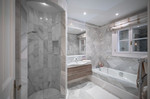The main floor accommodates the principal living areas, including a spacious living room with fireplace that flows seamlessly into the indoor dining room and an elegant covered porch, perfect for enjoying outdoor living all year round. On this same level is the principal suite, comprising a generously sized bedroom, dressing room, and en-suite bathroom. The kitchen, fully equipped with Gaggenau appliances, combines practicality with sophistication and is complemented by an independent service area.