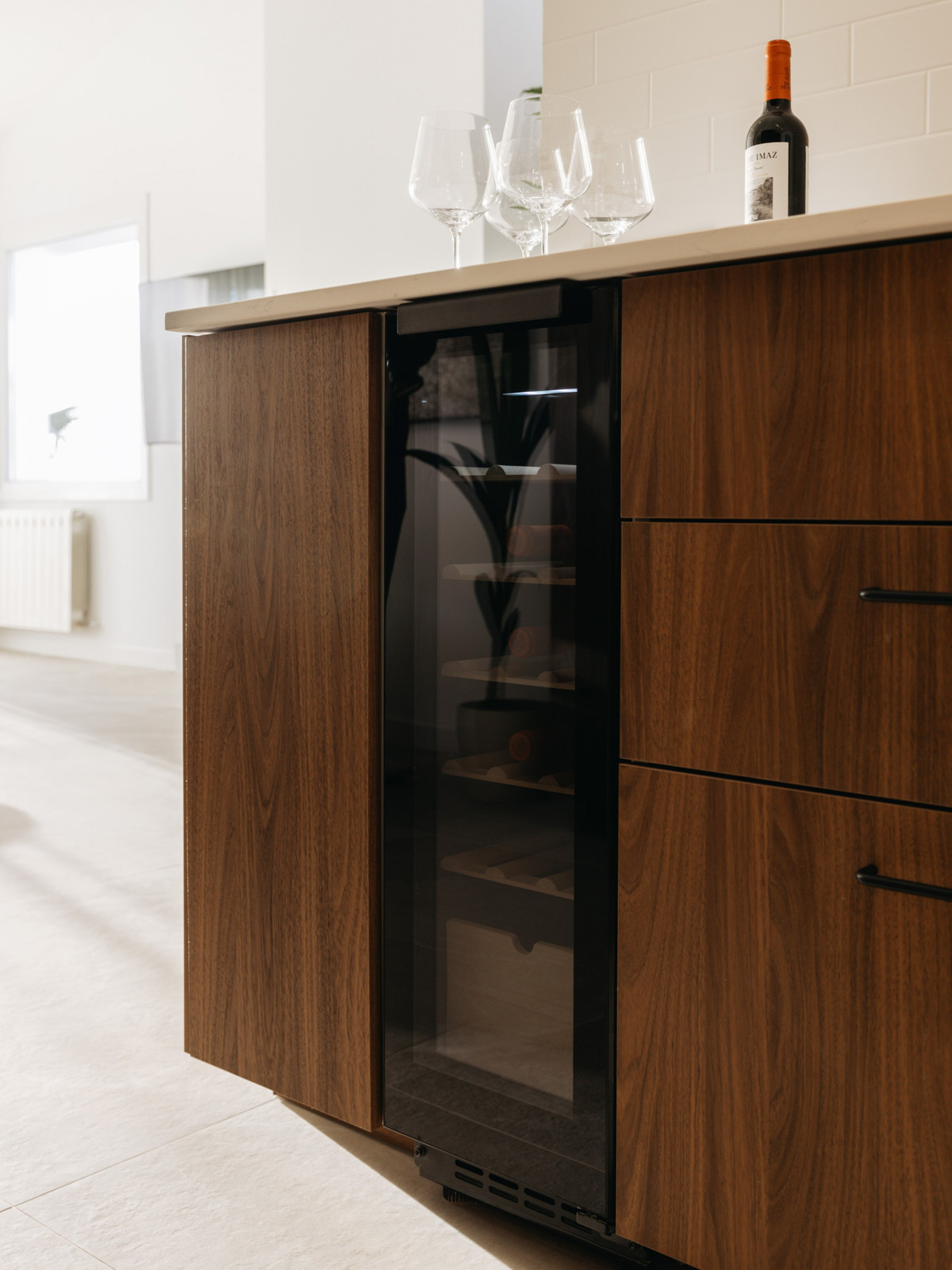 U komt binnen in een lichte en stijlvolle open woonruimte die naadloos de moderne keuken, eethoek en woonkamer combineert. De hoge plafonds creëren een prachtig gevoel van ruimte en natuurlijk licht, terwijl de gezellige open haard warmte en karakter toevoegt, waardoor de kamer perfect is voor zowel dagelijks leven als vermakelijk.