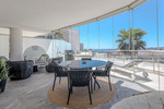 The spacious living area opens onto a generous covered terrace, part of which has been glass-enclosed to create an extended living space—perfect for enjoying the stunning views of the mountains, the sea, and the port of Fuengirola all year round.